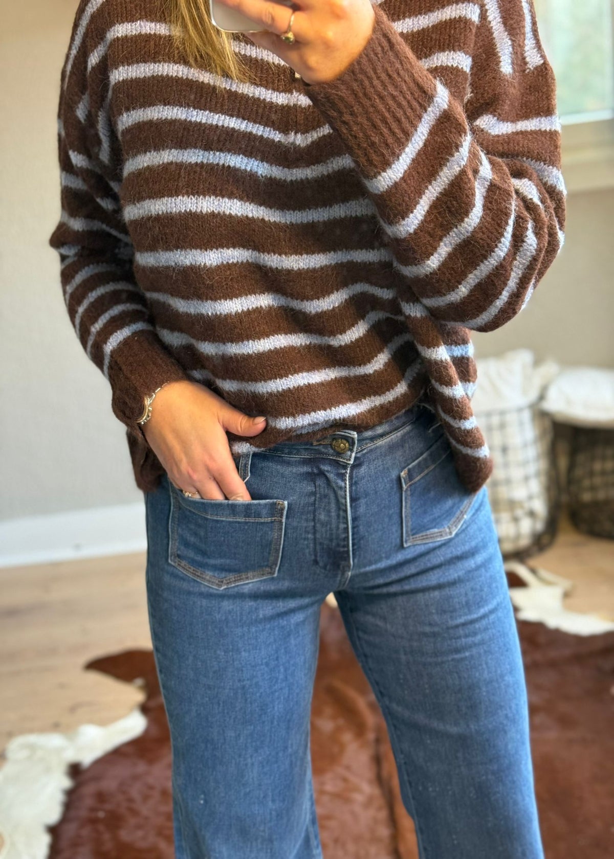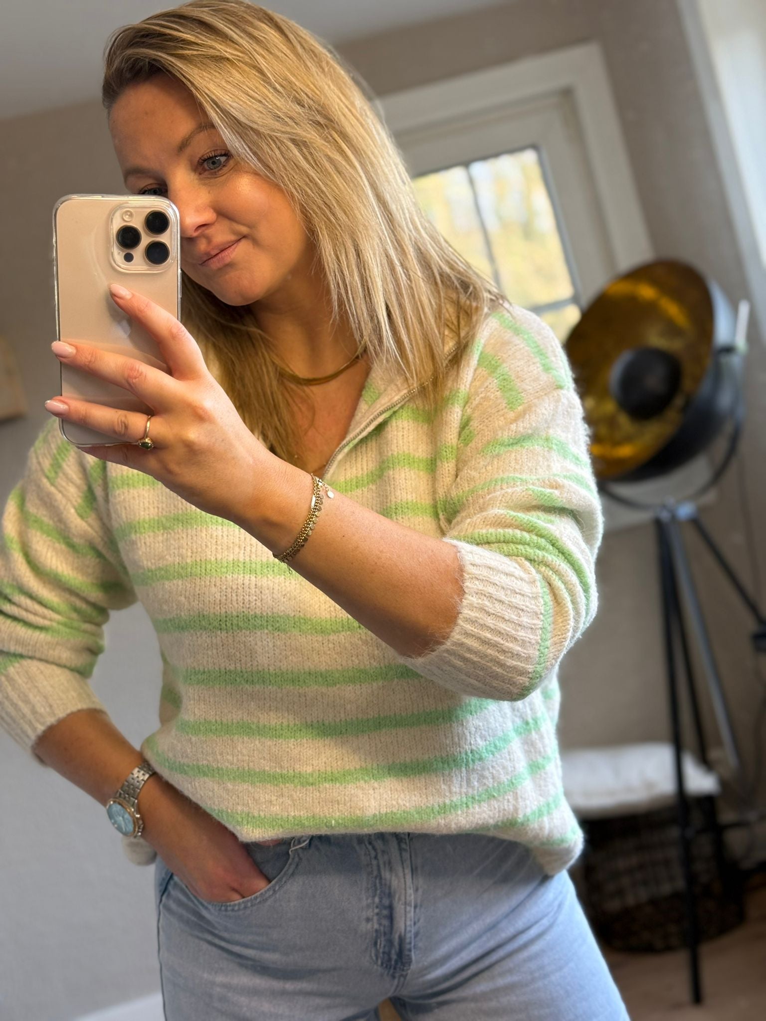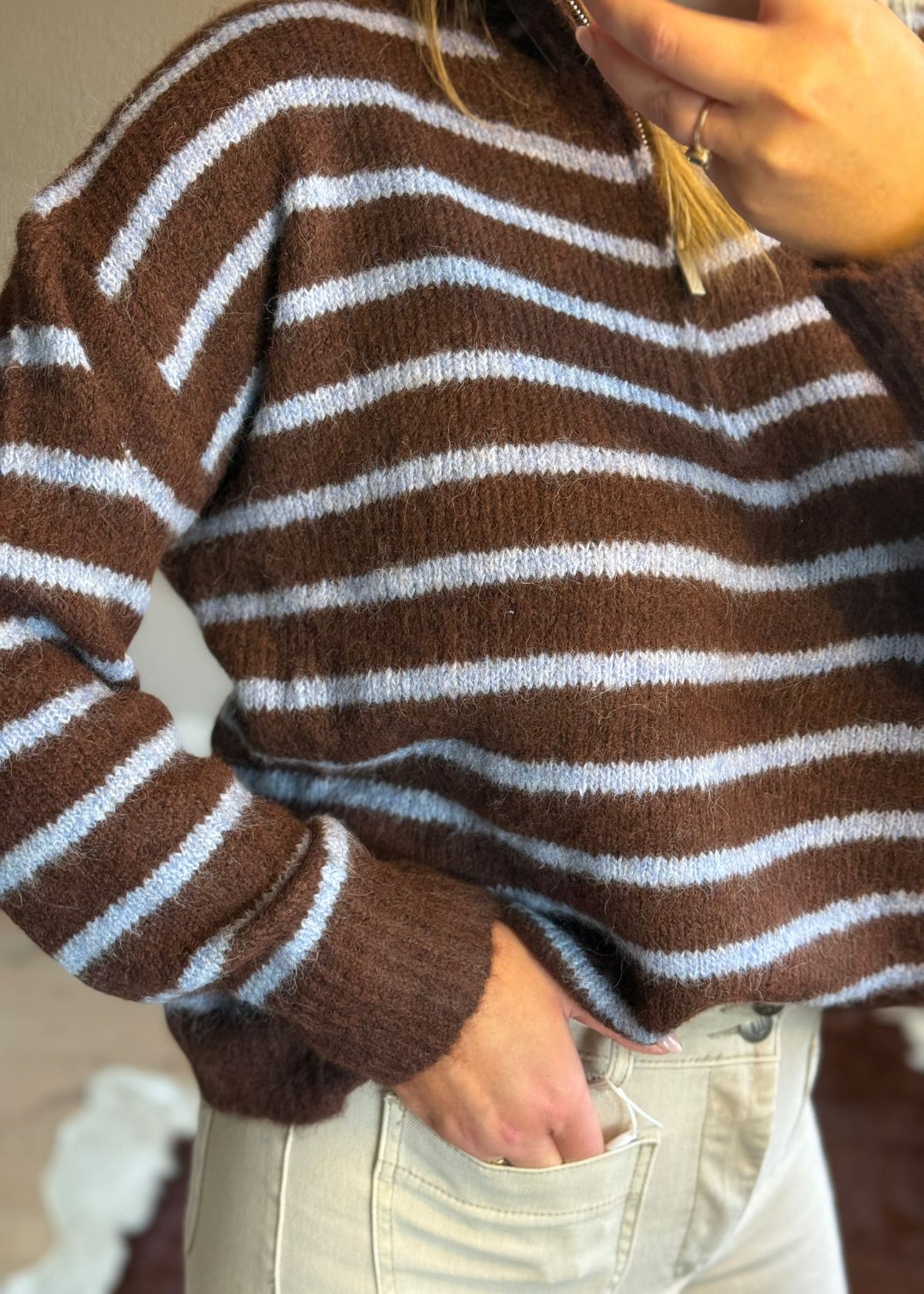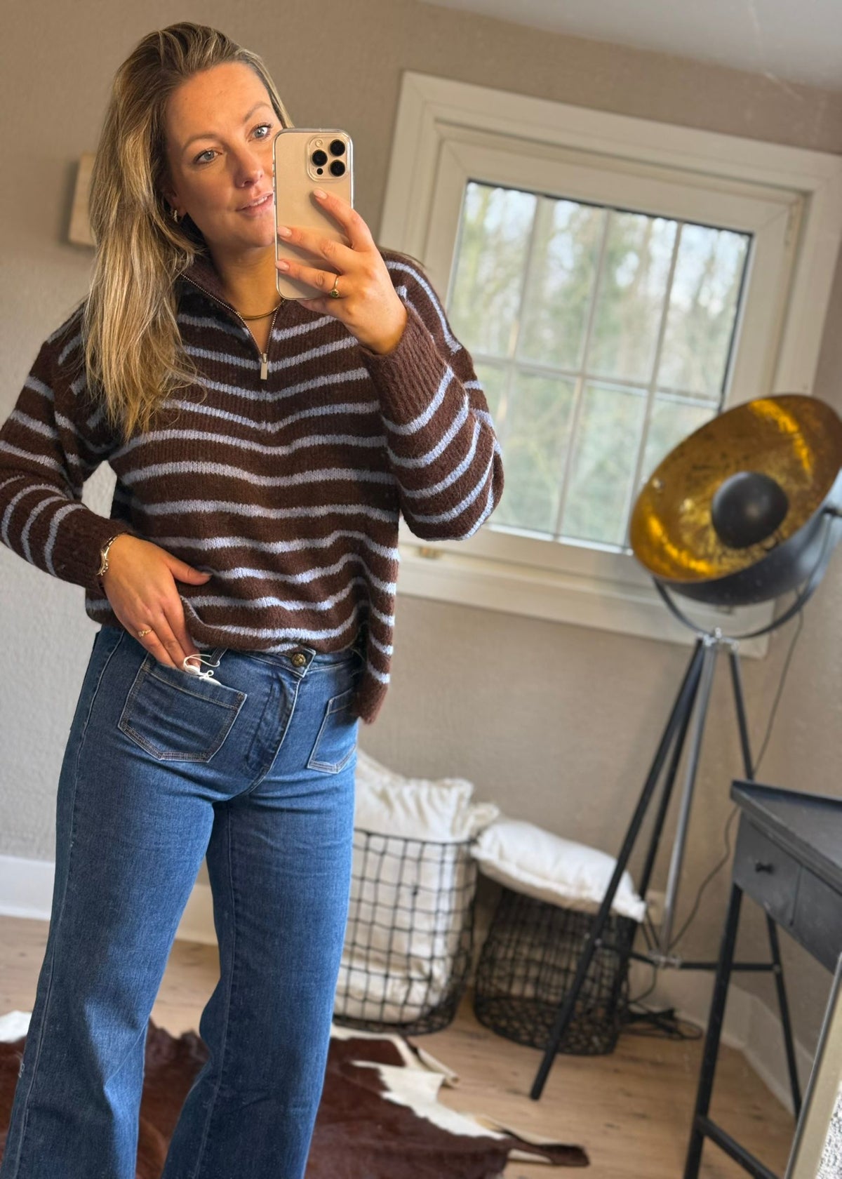 Zachte trui bruin/blauw gestreept truitje met rits en kraag